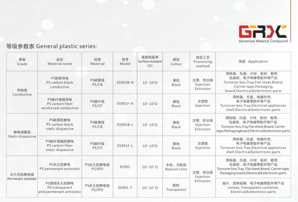 導電防靜電PS是以PS原料為基料,添加碳纖、碳黑,、永久性抗靜電母粒等混煉而成,可達到抗靜電、靜電消散、導電和電磁波干擾( EMI)屏蔽等功能,導電防靜電PS具有較高的沖擊強度和韌性、加工流動性型、抗化學腐蝕,以及低吸水率、尺寸穩定等特點。